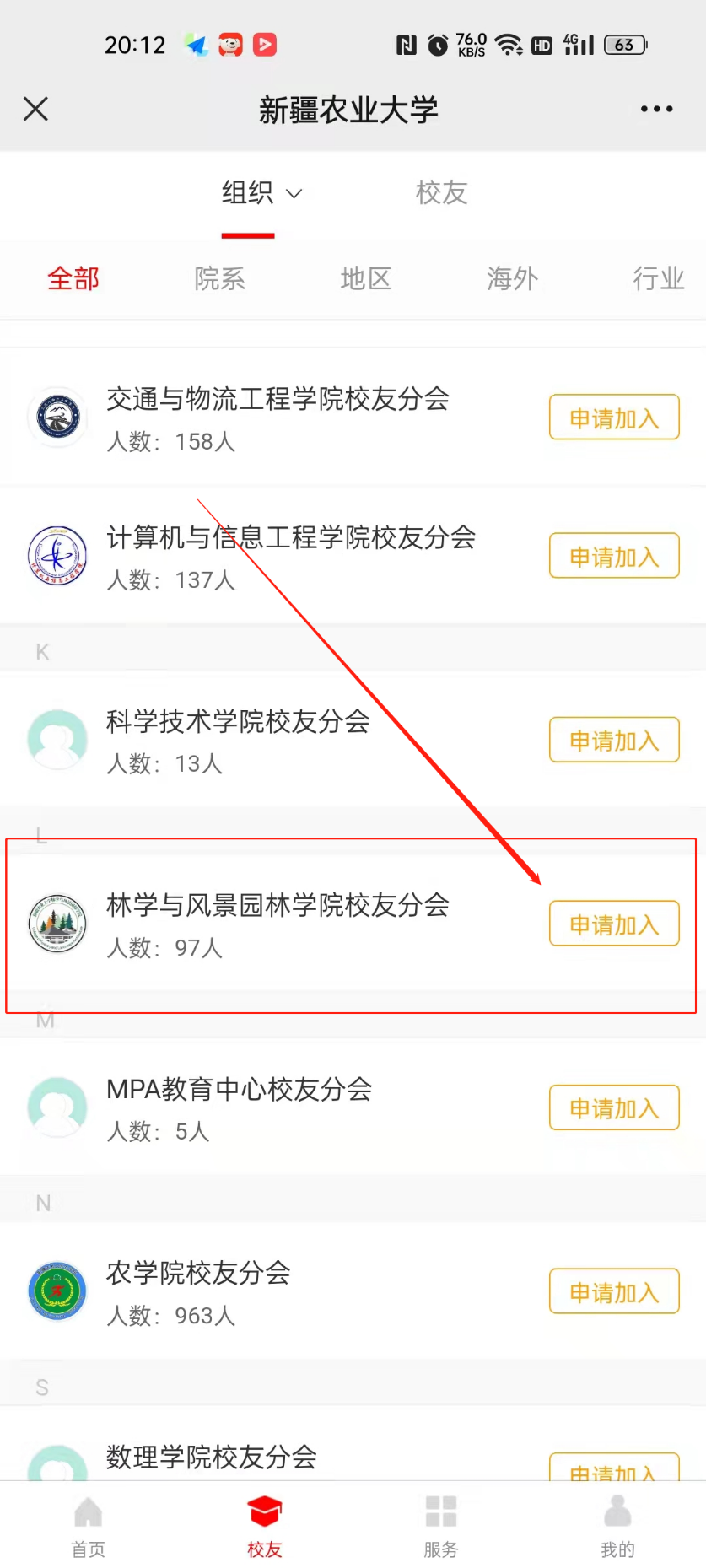 4.在点击“校友”一栏后,寻找荣光电竞 点击“申请进入”