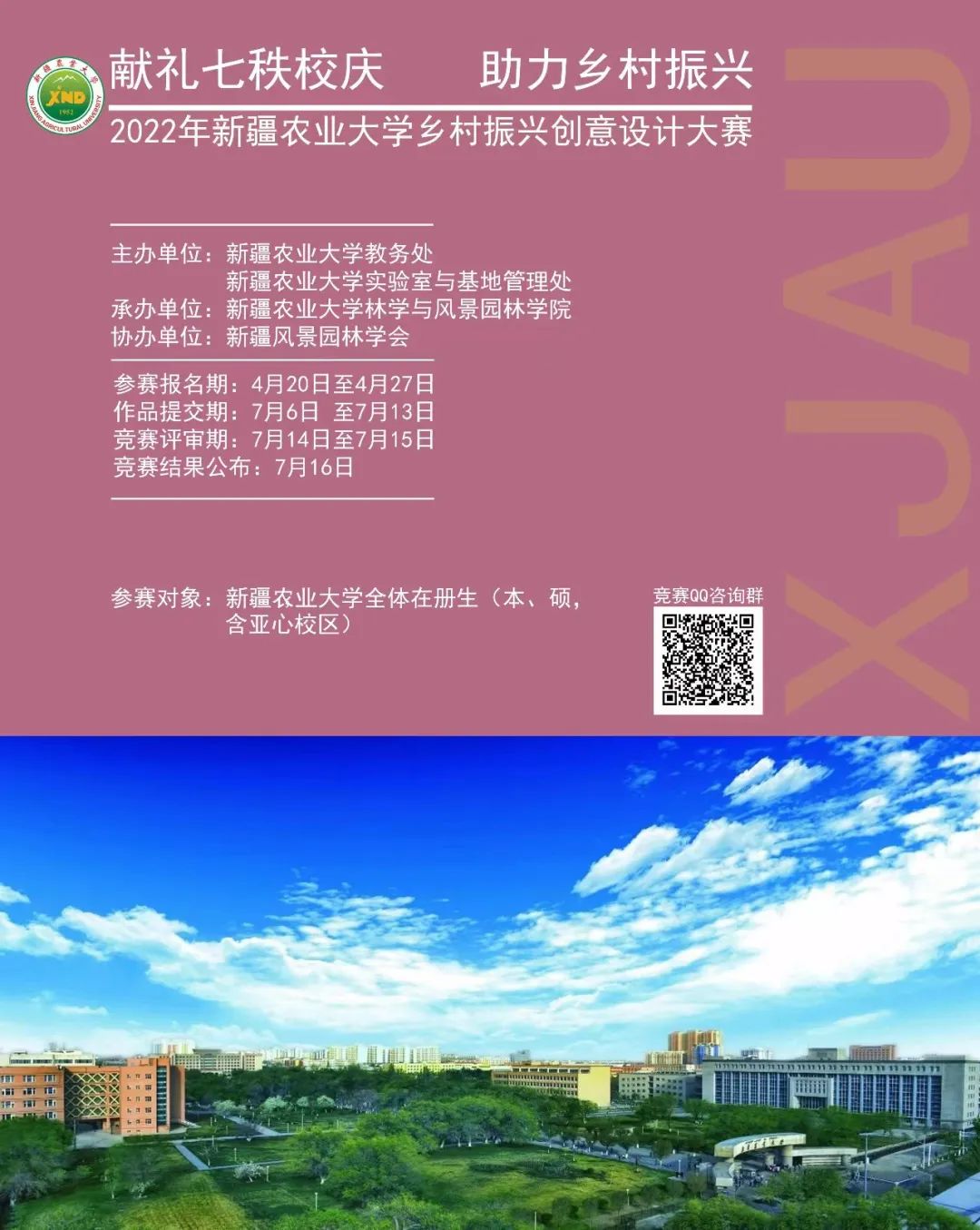 本次大赛主题为 “献礼七秩校庆,助力乡村振兴”。为吸引更多农大学子参与活动,本次大赛分为两个竞赛单元:乡村公园规划设计和新疆特色农产品品牌标识设计。