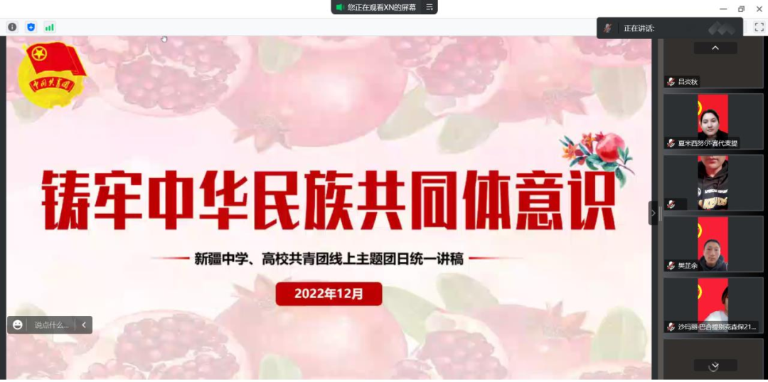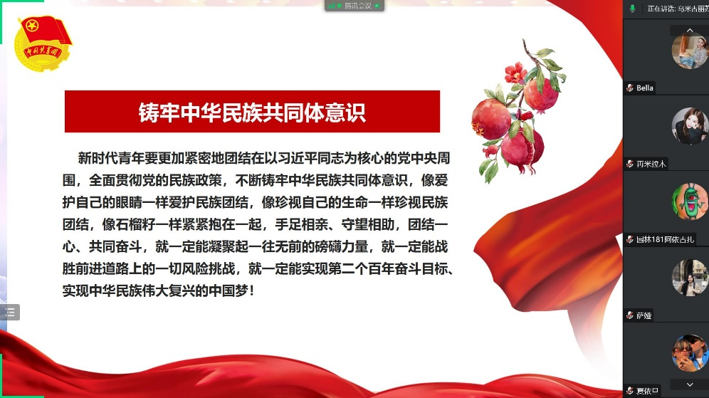 本次团日活动采取由各团支部书记线上带领学习的方式进行,深刻把握党和国家事业发展对民族工作提出的新任务新要求,谋长远之策、行固本之举,深入学习“铸牢中华民族共同体意识”这一重大论断。铸牢中华民族共同体意识,就是要引导各族人民牢固树立休戚与共、荣辱与共、生死与共、命运与共的共同体理念。踏上实现第二个百年奋斗目标新征程,我们要认真学习贯彻习近平总书记关于加强和改进民族工作的重要思想,深刻认识铸牢中华民族共同体意识是新时代党的民族工作的“纲”的历史必然性、极端重要性和现实针对性,切实铸牢中华民族共同体意识。