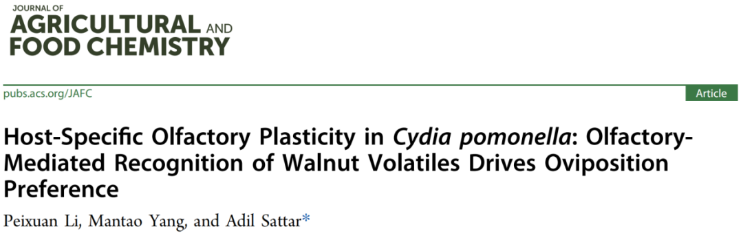 阿地力·沙塔尔教授团队在《Journal of Agricultural and Food Chemistry》(中科院一区,IF = 6.2)发表了研究成果,论文题为“Host-Specific Olfactory Plasticity in Cydia pomonella: OlfactoryMediated Recognition of Walnut Volatiles Drives Oviposition Preference”。对苹果蠹蛾寄主转化之间的嗅觉差异进行研究,为果园害虫精准防控提供了新方向。